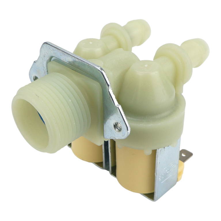 Электромагнитный впускной (заливной, наливной) клапан подачи воды (КЭН) для стиральной машины Indesit, Ariston, Whirlpool, Electrolux, Zanussi, AEG, Beko, Daewoo, Candy, LG, Samsung, Gorenje. 2 выхода 180 градусов (2W-180°). Тип контактов: клеммы. Диаметр выходов 12 мм. Резьба 3/4 дюйма. Напряжение 220 - 240 V, частота 50-60 Hz, допустимое давление 0,2-10 бар. Производство Италия.