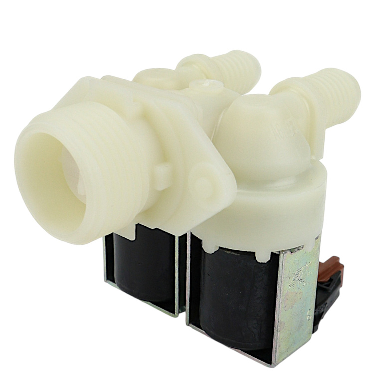 Электромагнитный впускной (заливной, наливной) клапан подачи воды (КЭН) для стиральной машины Electrolux, Zanussi, AEG, Gorenje, Privileg. 2 выхода 180 градусов (2W-180°). Тип контактов: фишки (клеммы mini). Диаметр выходов 12 мм и 14 мм. Резьба 3/4 дюйма. Напряжение 220 - 240 V, частота 50-60 Hz. Производство Китай.