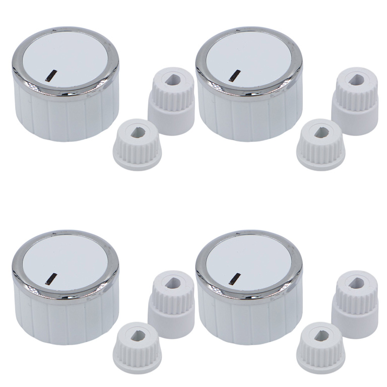 Комплект белых ручек с хромированной каймой. Поставляется набором из 4-х ручек и 8-ми переходников. Высота ручки 21 мм, внешний диаметр ручки 30 мм. Высота переходников 10 мм, 17 мм и 18 мм, диаметр посадочного отверстия 5 мм.
