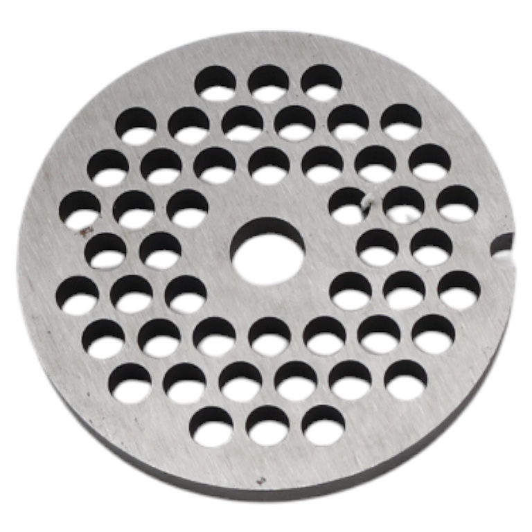 Решетка для мясорубки | Формирование фарша | Качество измельчения | Контроль консистенции | Назначение: Решетка является важным элементом мясорубки, определяющим степень измельчения мяса и формирующим структуру фарша. Обеспечивает контроль консистенции готового продукта через отверстия разного диаметра, влияя на качество и текстуру мясных изделий. | Ключевые преимущества: Точный контроль степени измельчения мяса; Формирование равномерной консистенции фарша; Износостойкая нержавеющая сталь; Сохранение сочности и вкусовых качеств; Простота очистки и обслуживания; Совместимость с различными моделями | Признаки износа: Увеличение отверстий от абразивного износа; Появление заусенцев и неровностей; Неравномерное измельчение продукта; Появление металлической стружки в фарше; Застревание жил и пленок в отверстиях; Снижение производительности измельчения | Технические особенности: Материал: нержавеющая сталь 40Х13; Диаметр: 50-82 мм; Толщина: 8-12 мм; Диаметр отверстий: 3-8 мм (мелкая), 5-10 мм (средняя), 8-13 мм (крупная); Твердость: 48-52 HRC | Совместимость: Предназначена для мясорубок Bosch, Moulinex, Zelmer, Panasonic, Saturn. Требуется подбор по диаметру и типу крепления. | Важно: Регулярно затачивайте кромки отверстий. Храните в сухом месте. Используйте решетки без видимых повреждений. | Соответствие стандартам для пищевого оборудования.